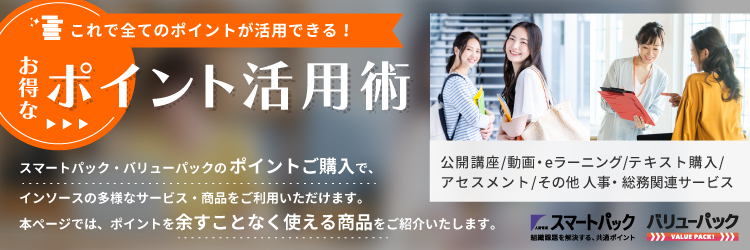 人財育成スマートパック(以下、スマートパック)とは、公開講座や動画教材・eラーニング、テキスト教材など、インソースの様々なサービスをお得にご利用いただける、ポイント制割引サービスです。
